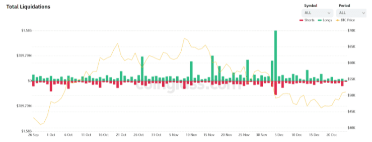Over the course of 2021, BTC saw two major vol spikes that saw it deviate from trend. The first was in February on the back of bitcoin’s stellar rise, cracking the 50K USD price level. The second was in May-June when it corrected heavily and sank below 35K USD. Notice how in the latest Nov-Dec correction (~30% drawdown from peak) implied volatility never quite spiked the way it did on those two earlier occasions? The most recent correction was more about deleveraging than it was about sentiment. The ‘fear factor’ was mostly manufactured by the pent up euphoria of irresponsibility levered longs. The $1.58B USD worth of positions that underwent liquidation on 4th December quickly put an end to the crisis. From there, it was mainly about making the climb back above 50K USD…and now we’re there!