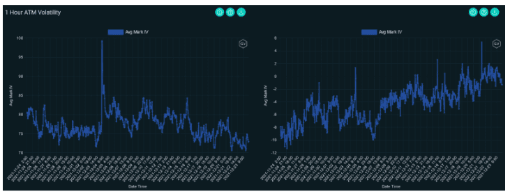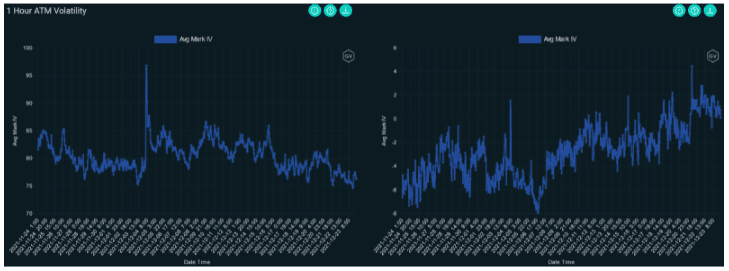 The right chart is Deribit’s 30/20 Skew which measures the difference in IV between calls (0.2 to 0.3 delta) and puts (-0.2 to -0.3 delta). It provides a gauge for how expensive calls are relative to puts.