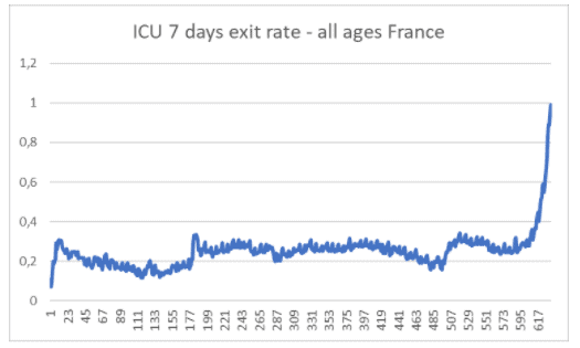 French COVID ICU 7-day exit rates, data since beginning of Pandemic. Notice how across the first three waves, the 7-day exit rate has hovered around 20%.