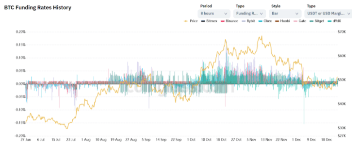 The deleveraging that occurred on 4th December flipped funding rates negative and kept it in negative territory for a week before stabilizing. Bitcoin funding rates have since reverted to neutral. The fact that BTC funding rates tend to be positive more often than negative from August to November indicates general bullishness over that period. We shall see whether that regime returns in H1 2022.