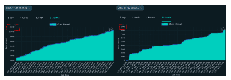 On the RIGHT, we see that moving the expiration date one week into the new year the volume in open interest for 3 month maturities drops by over 90%.