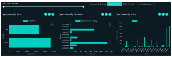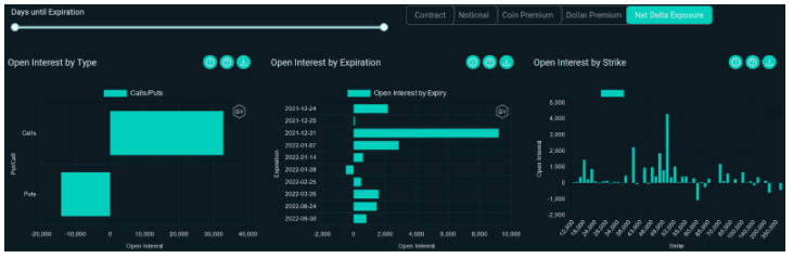 We see call dominance at 2021 year end leading into the first week of January 2022 around 50K call strikes. Delta then flips to negative at the end of January around 60K put strikes, thus signalling the market’s anticipation of a slight pause or correction at that point.