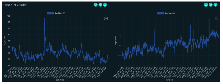 Between 1st and 4th December 2021, BTC corrected 28% which shows up in the IV spike from its 73 baseline to 103 (LEFT) before quickly falling back once those spot levered longs were taken out. In the derivatives space, BTC long puts booked profit and long calls stopped out.